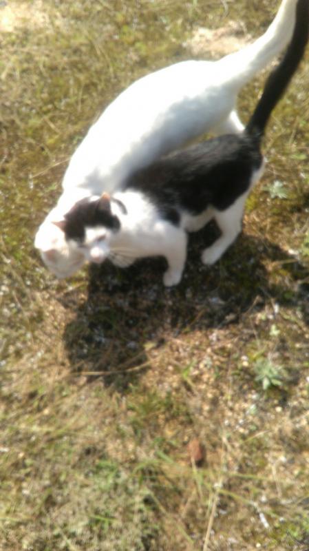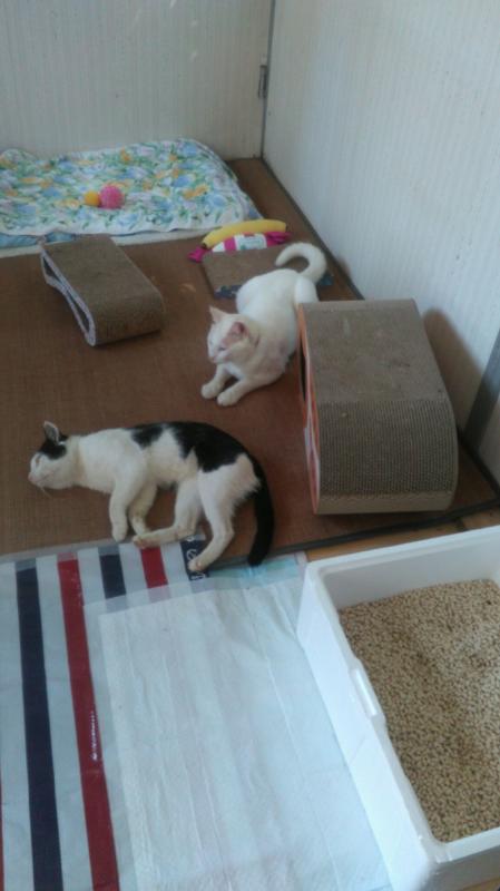 可愛い白ちゃんとノン君が引っ越しました、駐車場のプレハブです、広さは4畳位、ワンルーム、2匹は気に入って居る様子、仲良く遊び回っています、良く食べて良く飲んで良く寝てスクスクと育ってます。甘えん坊で私の顔を見ると、良い子良い子をおねだりで大変❤可愛いですよ本当に☺笑笑ニコニコ