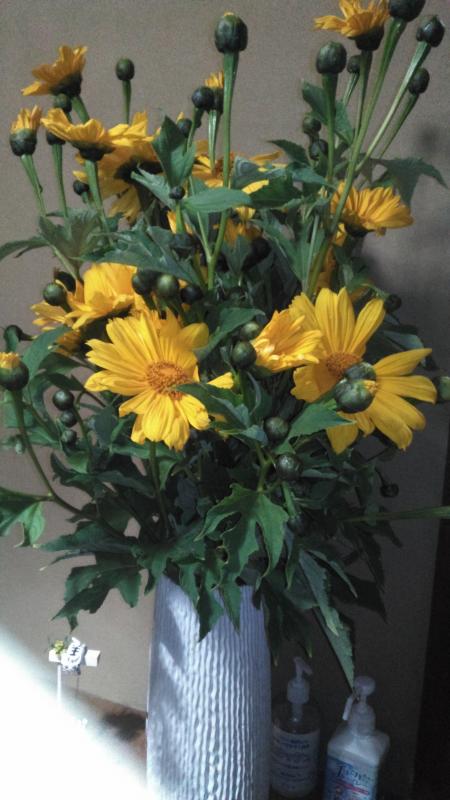 電話でこれからお花を持っていきます、私が大好きなヒマワリ草だったのです☺自宅で作られた立派で素敵な生き生きとして何とも言えない色合い☀まるで太陽様みたいなんです、精一杯手をひろげ天を見ている姿が又頼もしい、夢の文字か私の脳裏に浮かんで来るのです、又又素晴らしい元気が出ました、メリメリ、モリモリ☺そして微笑み☀それに何だか若返った感じ迄も( ̄▽ ̄;)は👍嬉しかったで~す☺ニコニコで~す☺図々しいですが来年もお待ちしても宜しいでしょうか。笑笑ニコニコ
