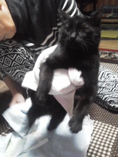 もう50日位になりますか、まだ自分でオシッコが思うように行きません、日に何回かわたしが手伝っております、歩くのも?焦らず頑張ってね、といいながら早く歩けることを願ってます、食べる事は上手に食べてくれます、野良猫のせいか又怖い思いをしたせいかまだ心を開きません、これも焦らずその日を待ちます、もお一匹の百々ちゃん猫はミンミに余り興味がなく知らんぷり、マイペースな百々ちゃん、いじめるより良いかも?ニコニコ