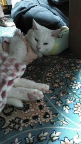 寒くなり猫のモモは温かいホットカーペトの上に、犬のジーナ、ボタン、新人の生まれてからこの19日で1回目の誕生日…