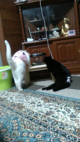 オタマジャクシからかえったばかりの小さい青ガエルを毎日見て楽しんでいる猫さんのももちゃんとミンミちゃん、しかし…