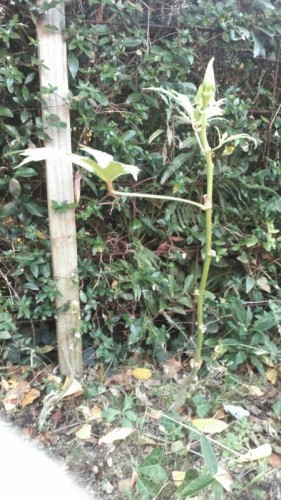 寒さの中で7月に植えたオクラの木、勉強不足の為に起こった事、トマトとキュウリの側にすき間をあけずに?オクラの苗…